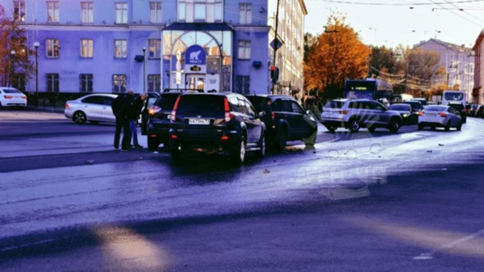 В Мурманске на перекрёстке у Ледового дворца столкнулись три машины. Как это произошло, пока неясно.