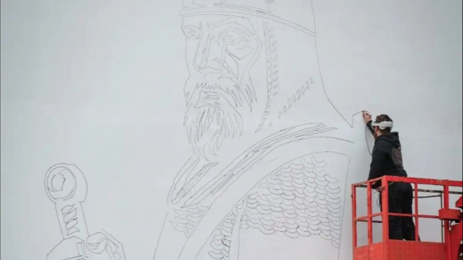 Северянин в VR-очках создает мурал на фасаде школы в Великом Новгороде