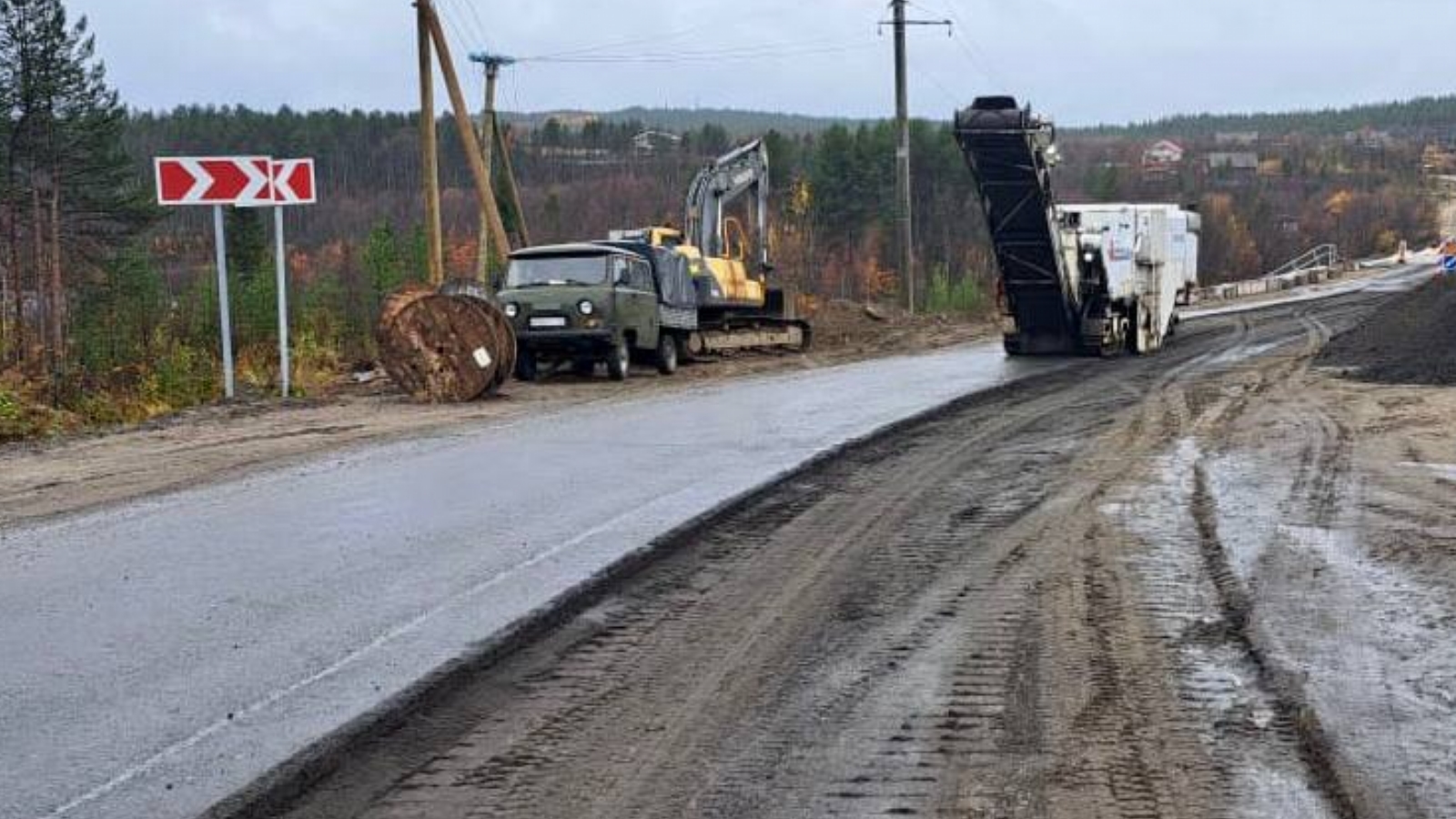 Одновременно с этими работами специалисты производят фрезерование асфальтобетонного покрытия на подходах к мосту.