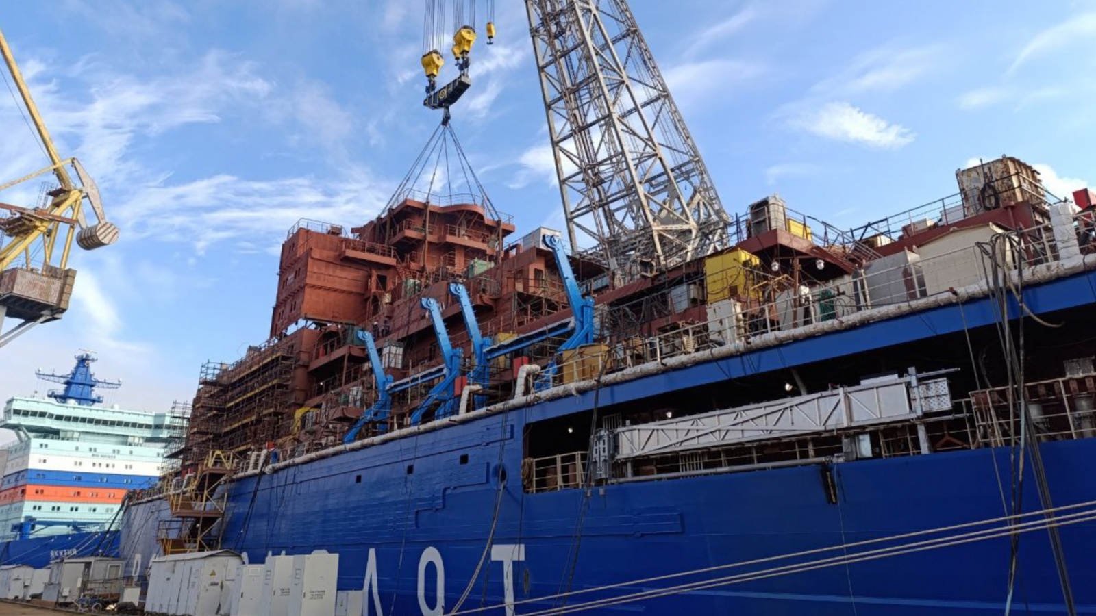 Специалисты Балтийского завода ОСК в рамках формирования надстройки универсального атомного ледокола проекта 22220 «Чукотка» погрузили на борт судна укрупнённый блок секций. В нём расположатся, в частности, шахты отделений вспомогательной энергетической установки атомохода.
