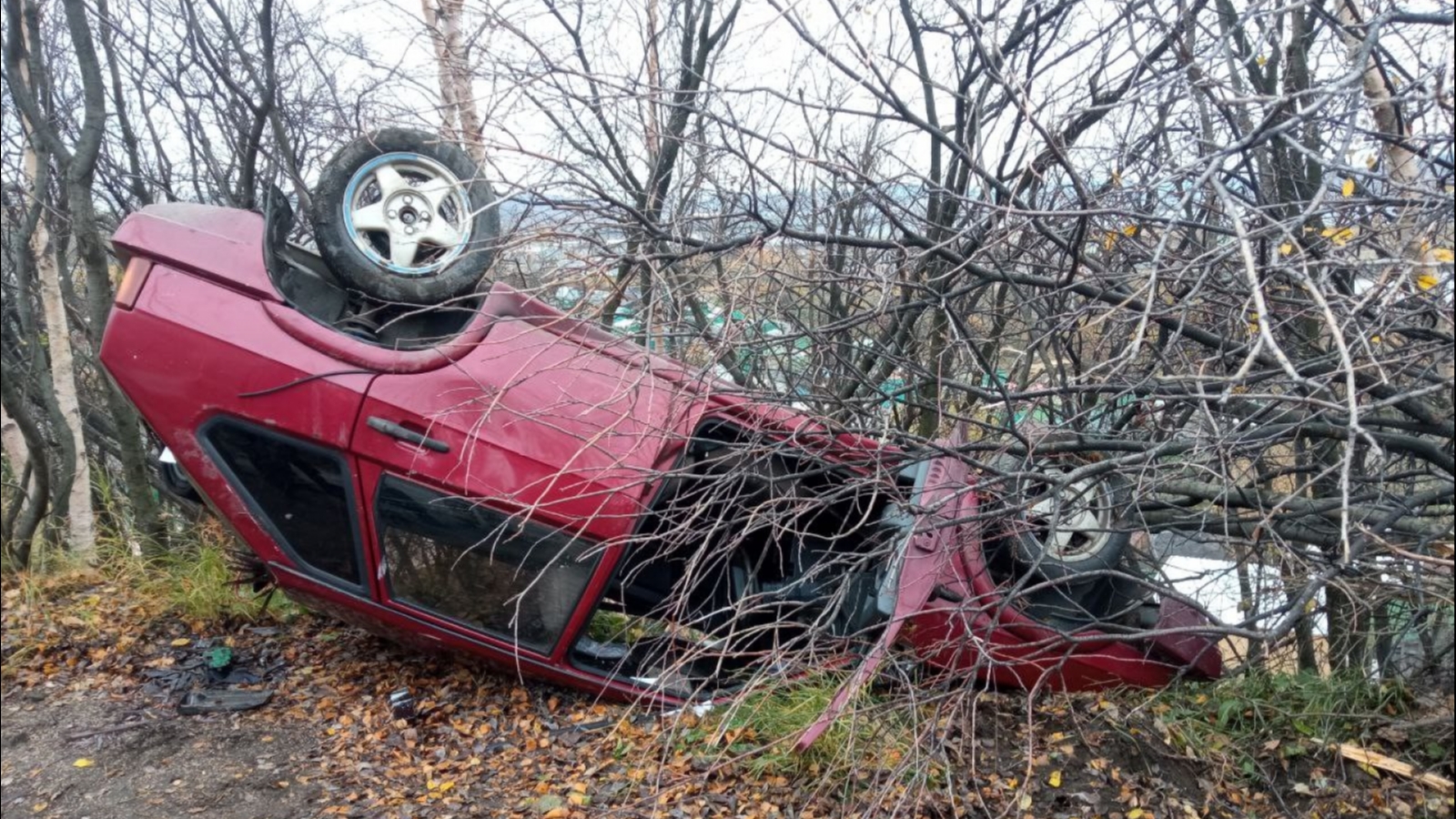 В Мурманске на перекрестке улиц Достоевского и Прибрежной автодороги произошла авария. Там вылетел в кювет и перевернулся легковой автомобиль ВАЗ 2109.