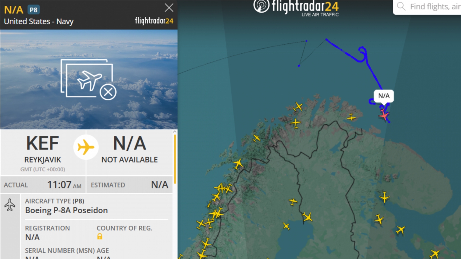 Противолодочник ВВС США вылетел из Рейкьявика в 14.07 по московскому времени и теперь кружит в Баренцевом море, недалеко от северного побережья Мурманской области.