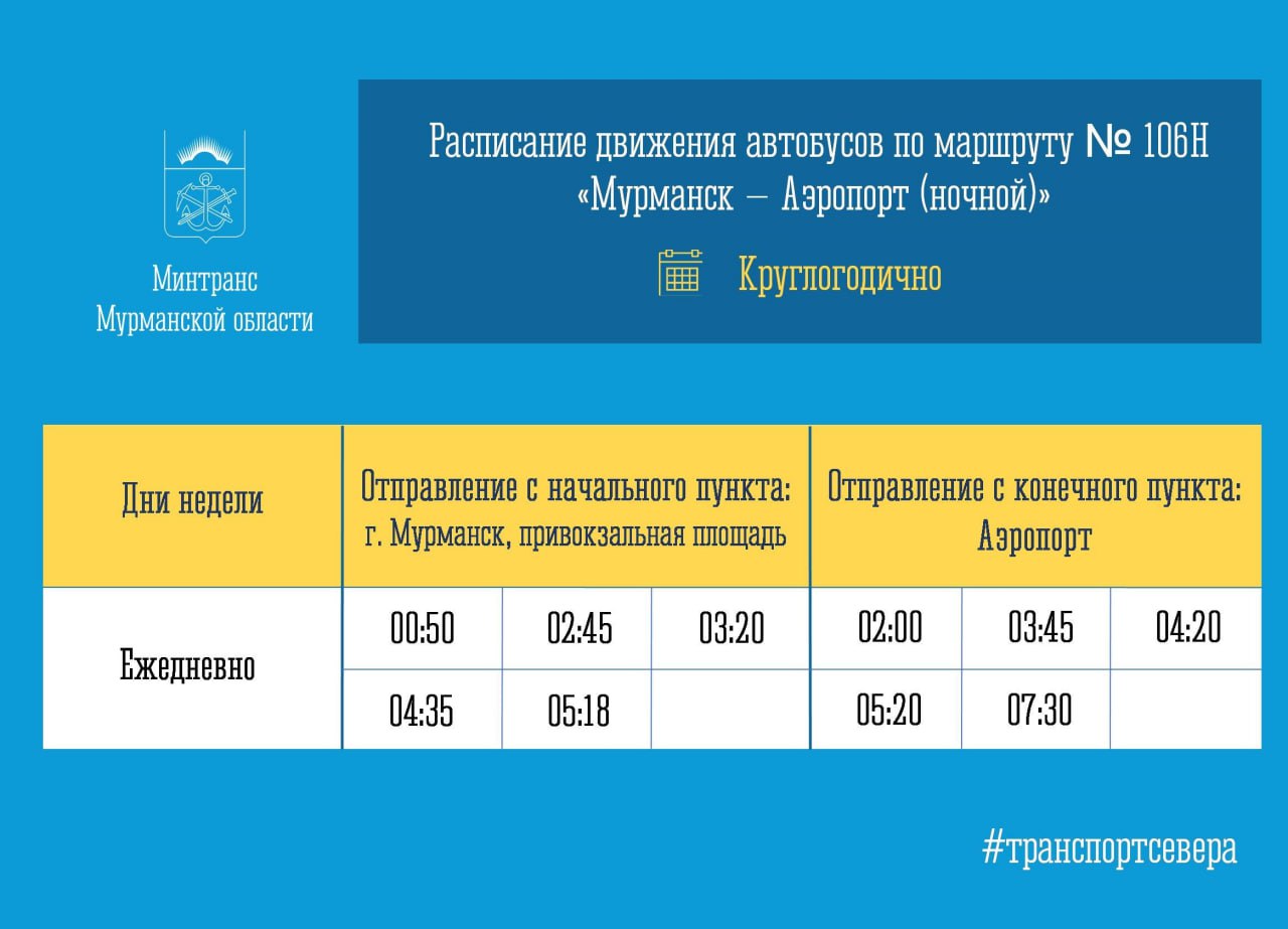 С 20 октября вносятся изменения в расписание движения автобусов по маршруту № 106 «Мурманск - Аэропорт (ночной)». Об этом сообщил региональный Минтранс.