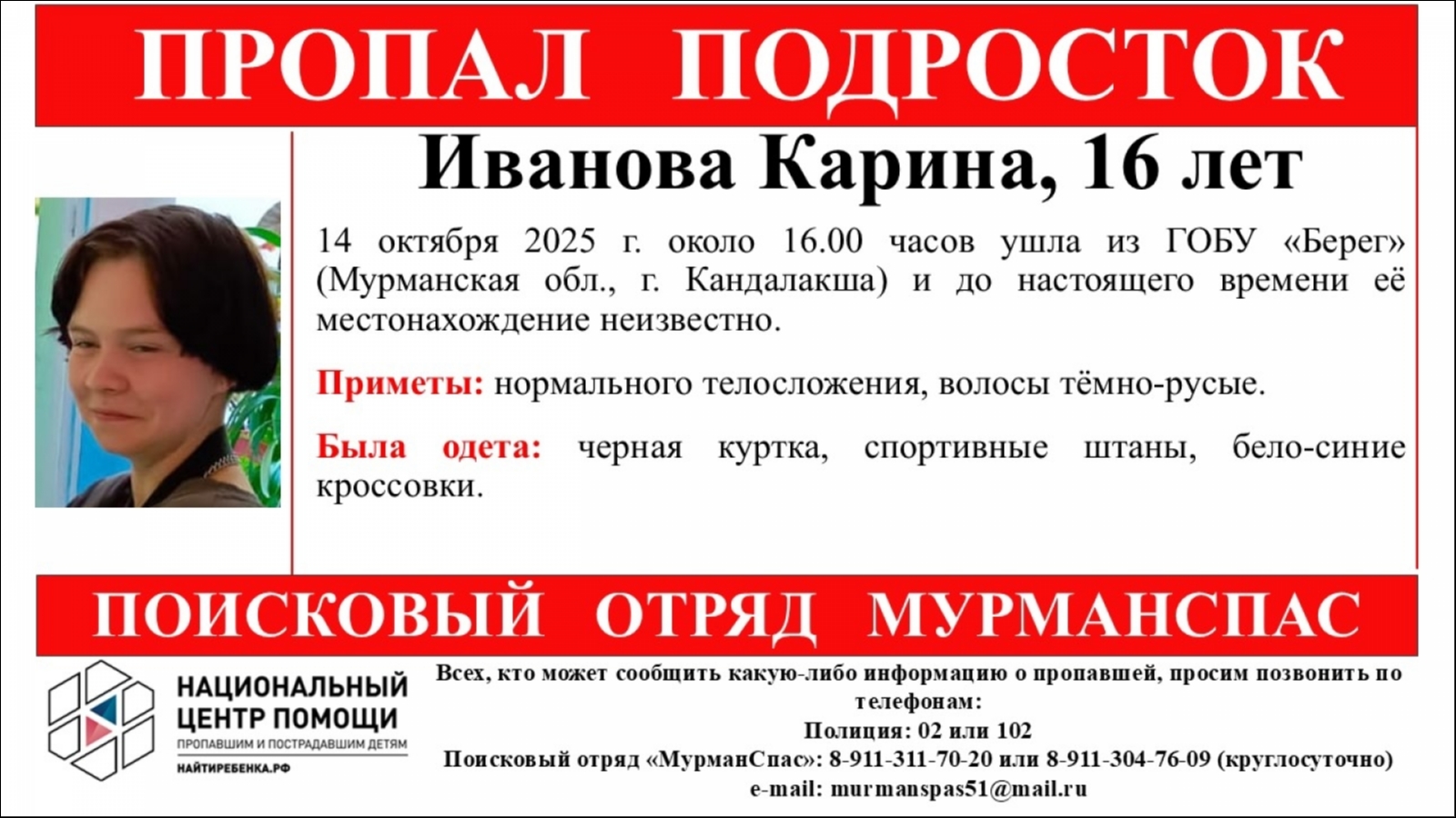 В Кандалакше ищут 16-летнюю Карину Иванову. 14 октября около 16 часов она ушла из детского дома «Берег» и пропала.