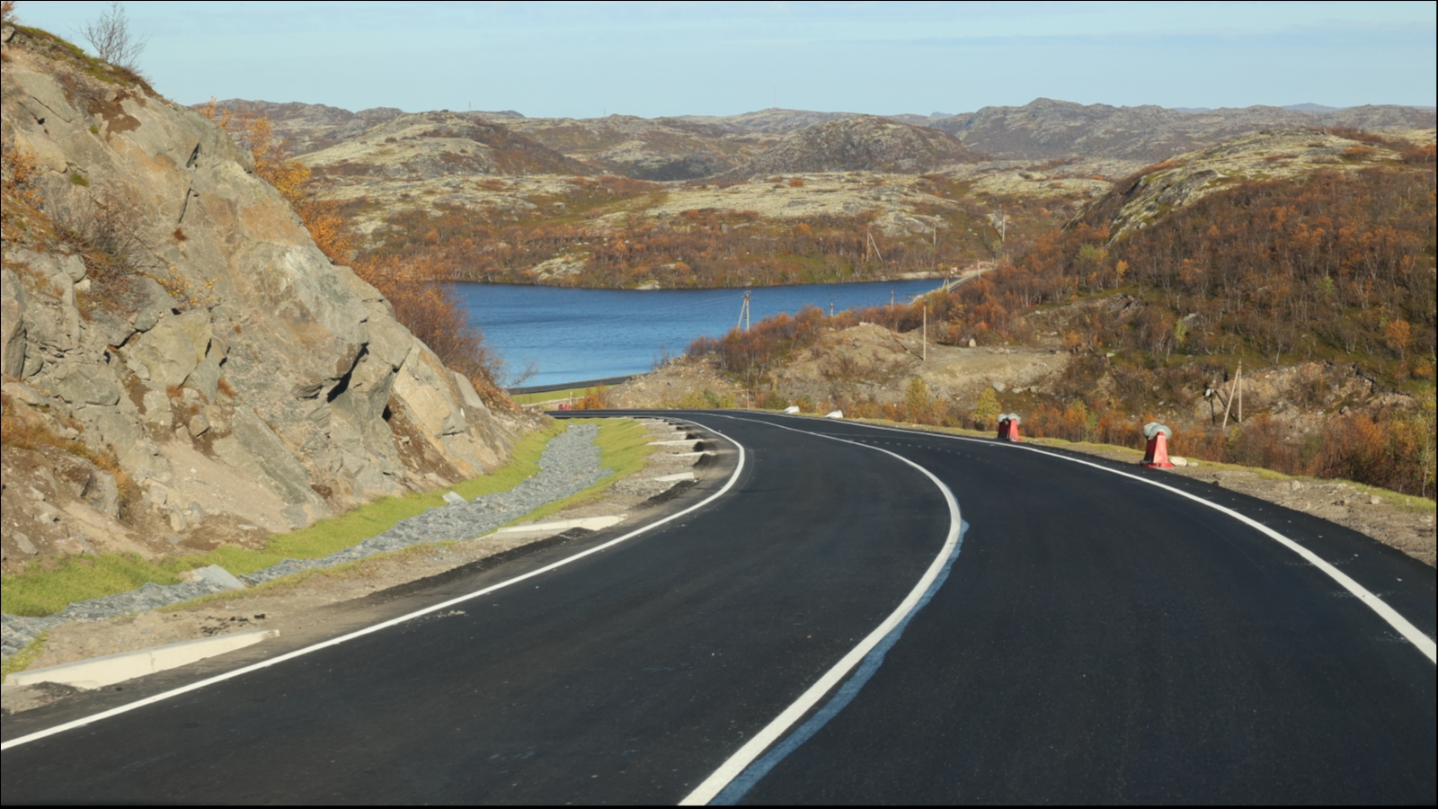 Большой объем работ на дороге в Териберку был выполнен в прошлом году. Строителям пришлось проводить масштабные буровзрывные работы для рыхления скальных грунтов, поднимать земляное полотно до трёх метров относительно старой дороги. Также было произведено устройство водоотводных и очистных сооружений и многослойной дорожной одежды с применением геотекстиля.