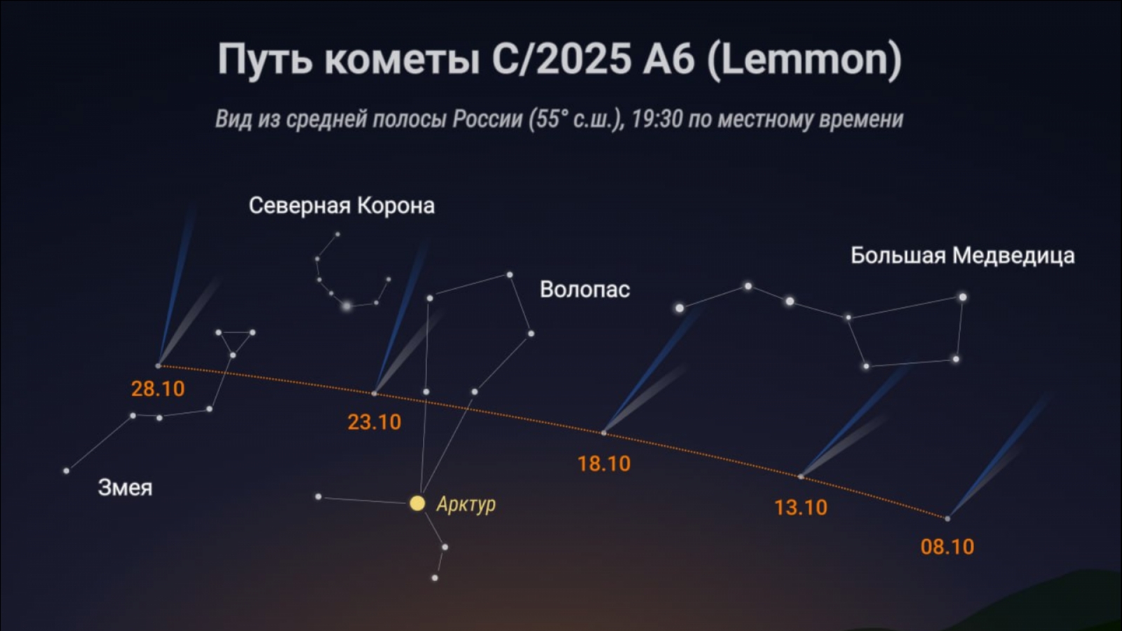 Ближайшие дни комета будет находиться левее Большой Медведицы, и лучше всего будет видна на вечернем небе с 19 до 21 часа по местному времени над северо-западной частью горизонта.