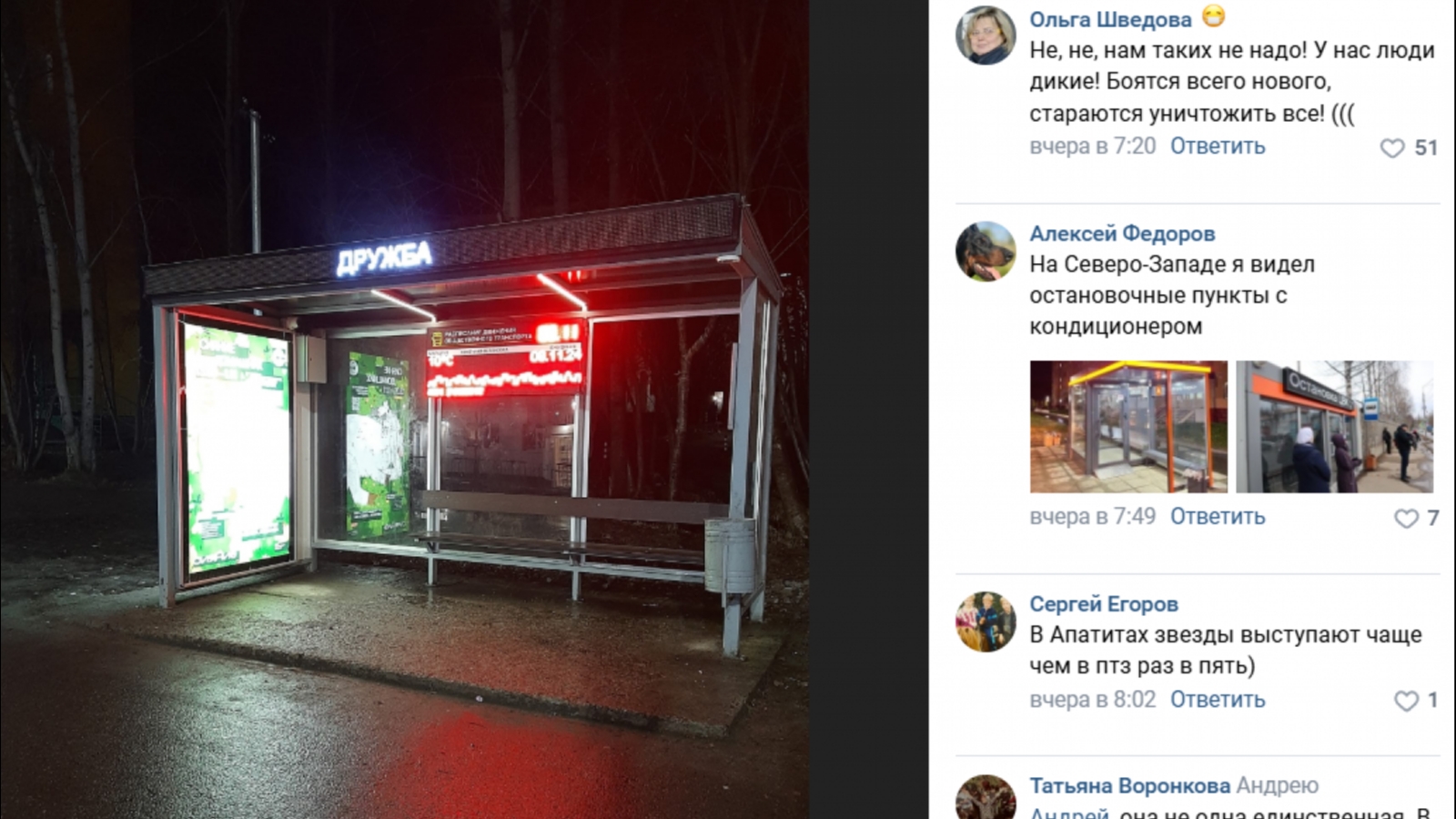 «Вот, пожалуйста:)) И камера, и урна, и расписание, и реклама, и чисто. Малюсенький городок Апатиты в Мурманской области», — пишут в паблике.