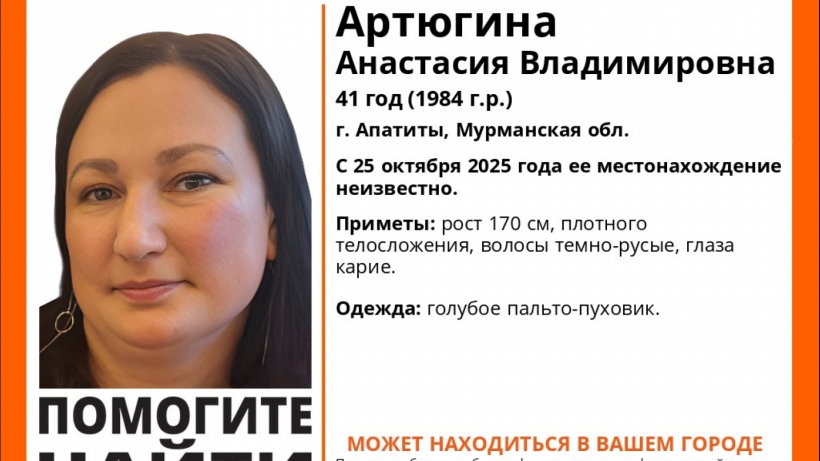 В Апатитах ищут 41-летнюю Анастасию Артюгину. С 25 октября её местонахождение неизвестно.