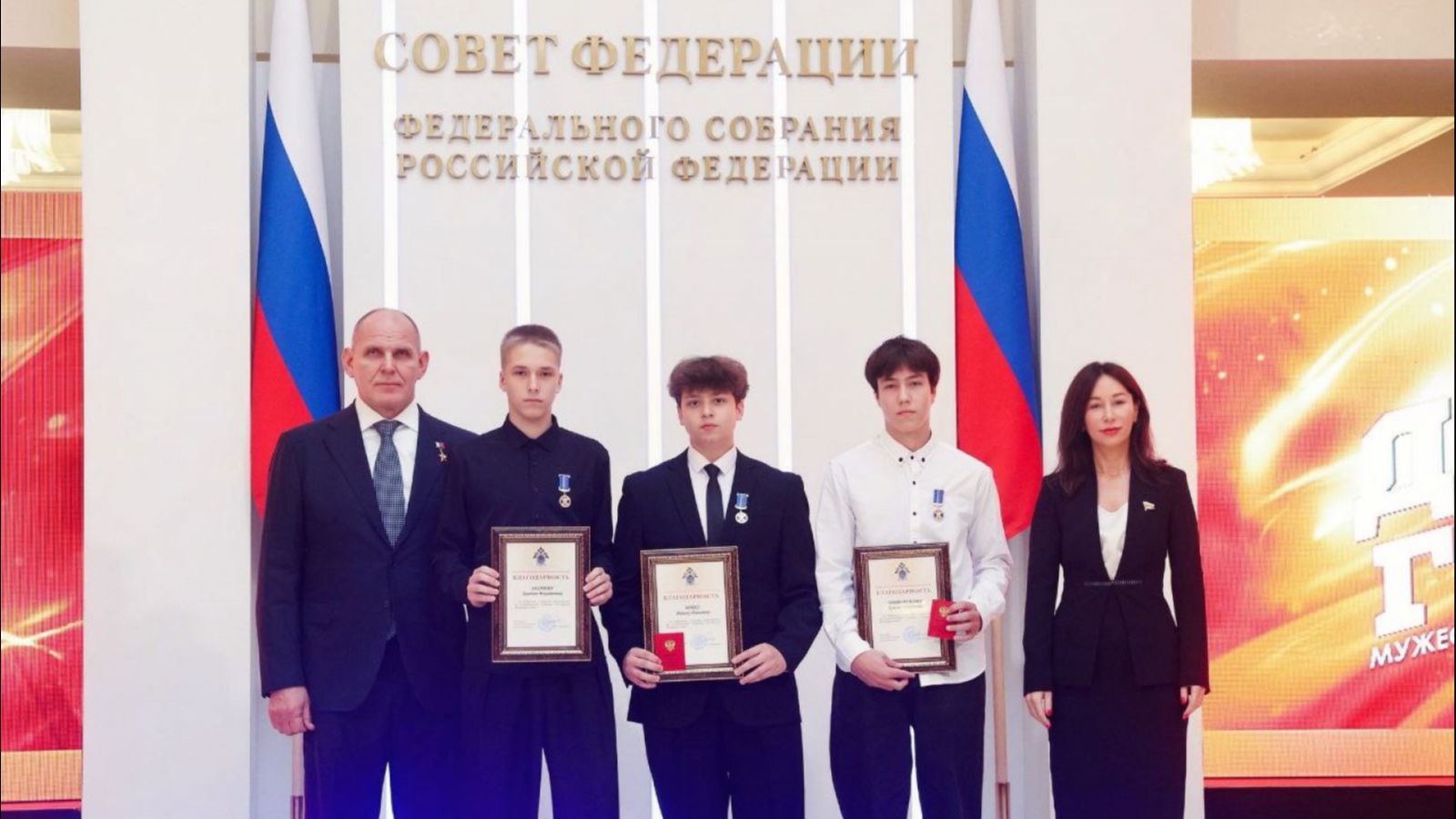 В Совете Федерации памятной медалью «За проявленное мужество» наградили Артёма Трибунского из Кандалакши, Евгения Захарова и Родиона Бойко из Никеля.