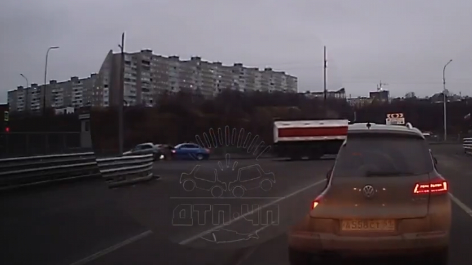 На записи видно, что машина выезжает с моста налево на зелёный свет и сзади в неё врезается BMW.