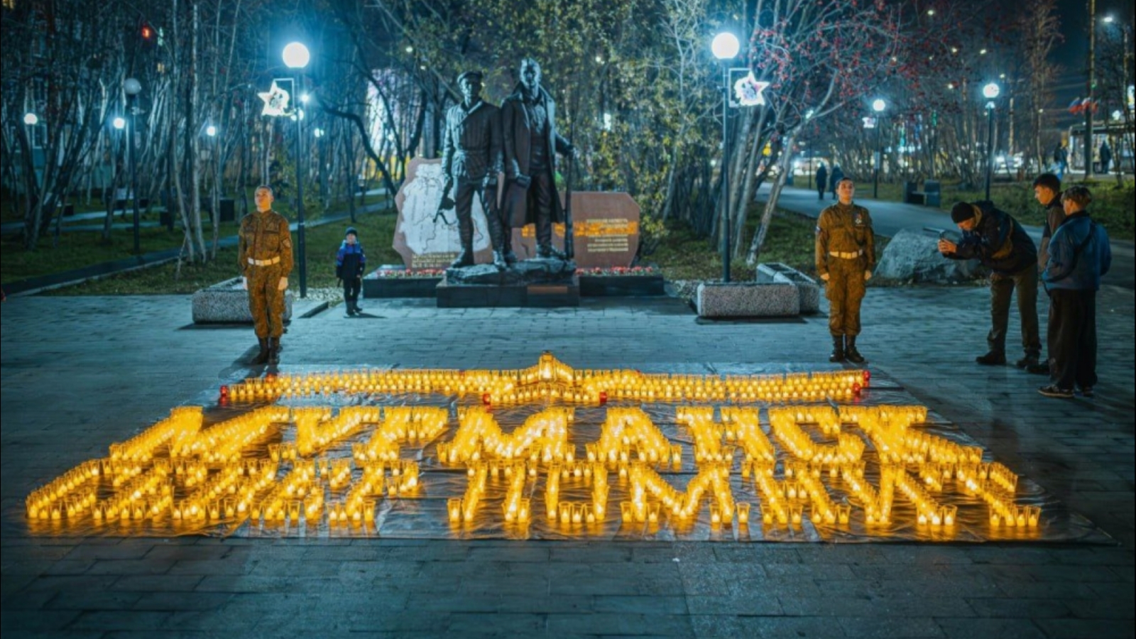 «У подножия памятника воинам добровольческого соединения волонтеры ДОБРО. Центра развития волонтерского движения выложили инсталляцию из более чем 1500 горящих свеч в виде георгиевской ленты и надписи «Мурманск. Север помнит». В центре композиции, по уже сложившейся традиции, была установлена лампада, зажженная от Вечного огня у мемориала Защитникам Советского Заполярья», - сообщили в администрации города.