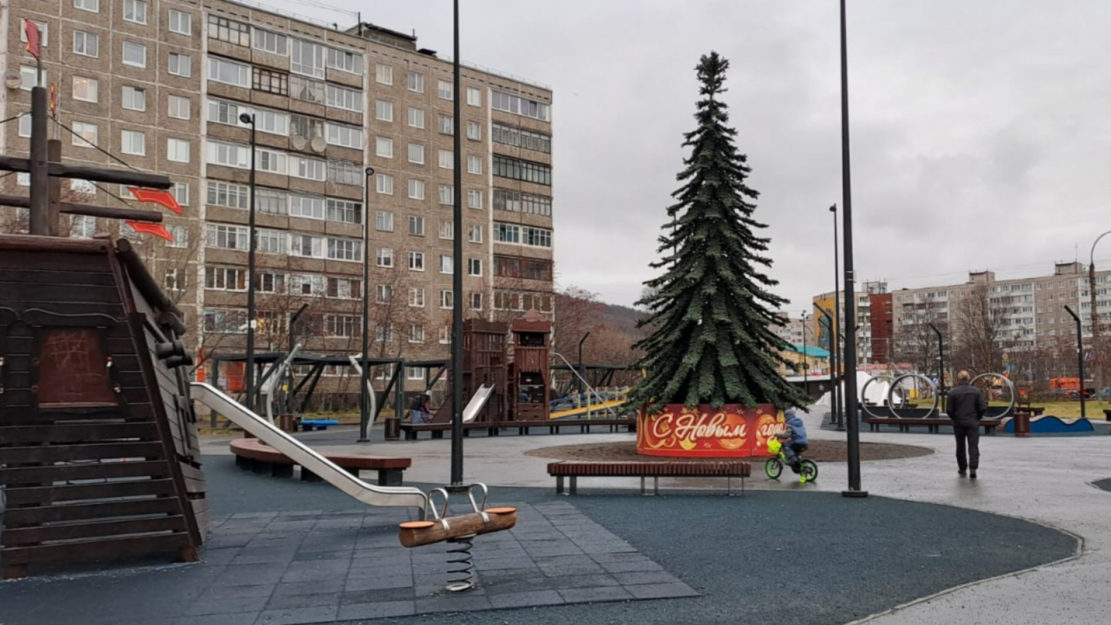 На фоне бесснежной осени и серого асфальта новогодняя ёлка выглядит непривычно.