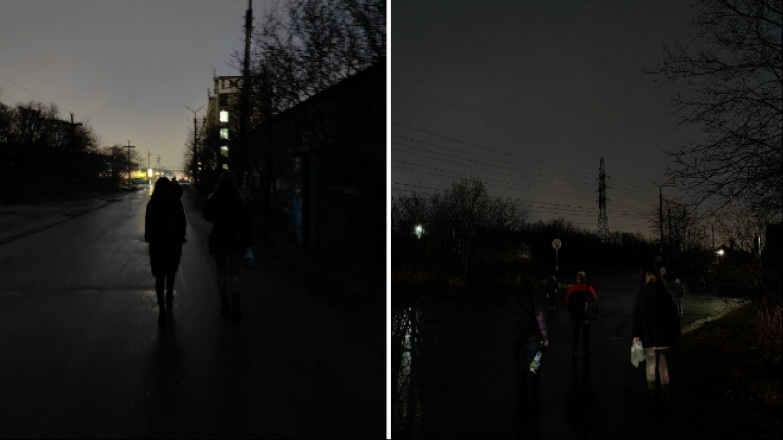 Людям приходится идти в темноте рядом с большим потоком машин. Северян возмущает тот факт, что опоры освещения вдоль дороги есть, светильники установлены, но света нет.