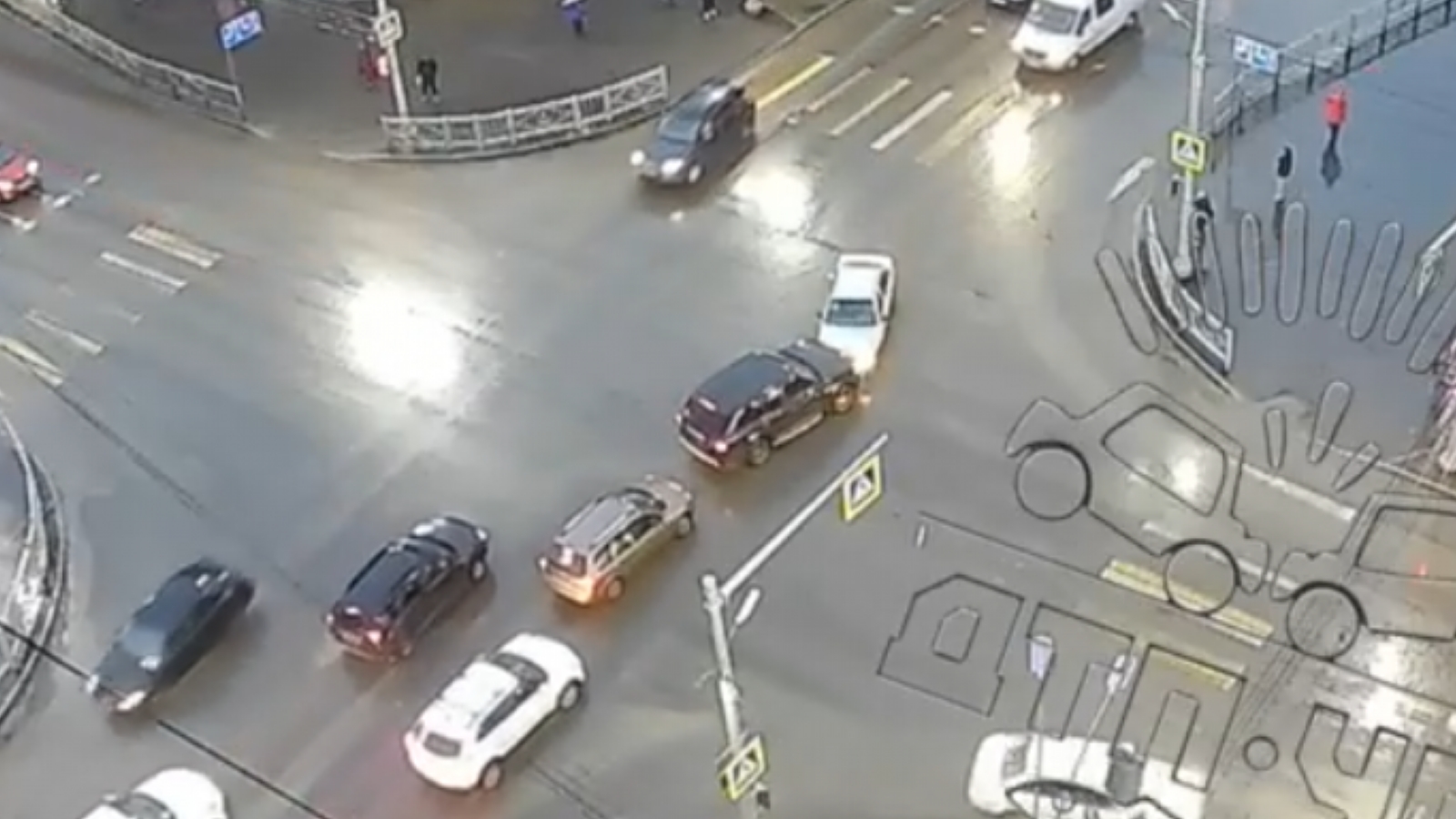 На записи видно, что одна машина ехала по Книповича в сторону «Детского мира». На перекрёстке в него врезался ехавший навстречу автомобиль, который поворачивал на Полярные Зори.