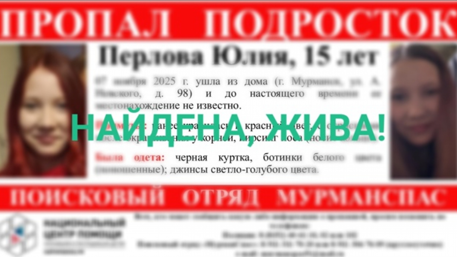 В Мурманске была найдена пропавшая девушка в белых ботинках. 15-летняя Юлия Перлова найдена живой.
