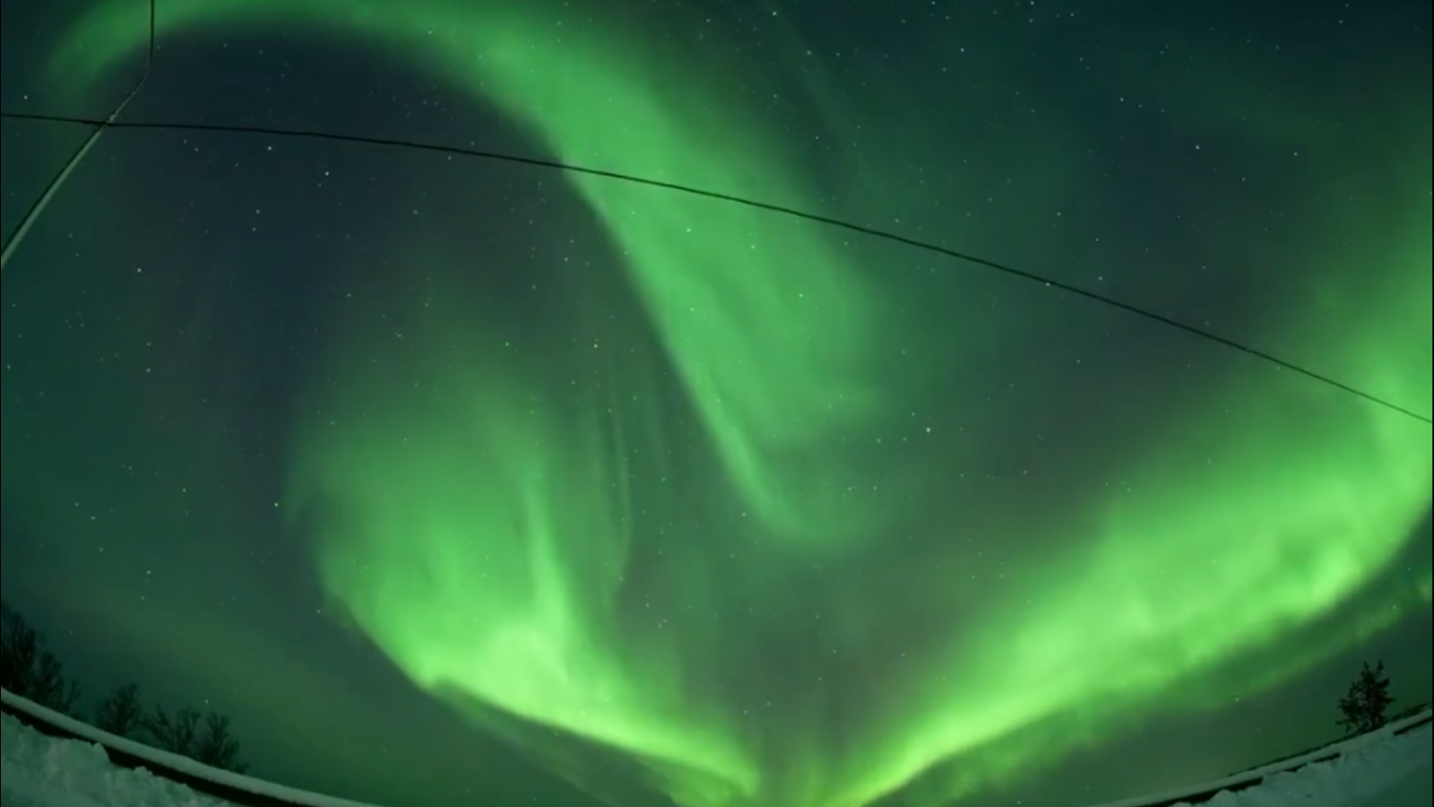 На кадрах видно, как по небу бегут, извиваясь в причудливые формы, изумрудные волны.