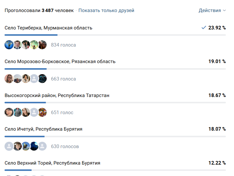 На момент написания статьи проголосовали 3 478 человек. Териберка занимает 1 место, за неё отдали голоса 834 человека (23,92%).