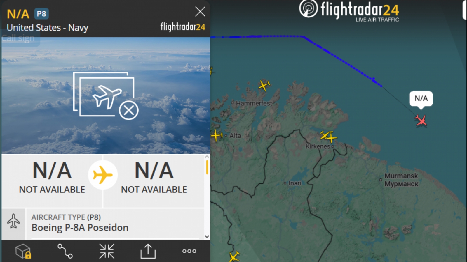 В Баренцевом море работает американский Boeing P-8A Poseidon. Самолёт вылетел с базы Кефлавик в Исландии.