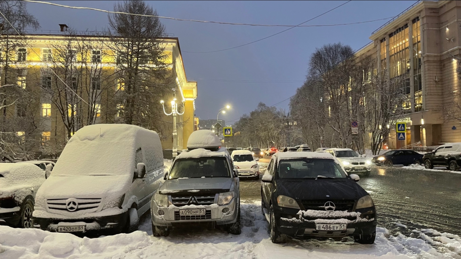 Машины перегородили проход для пешеходов в центре Мурманска
