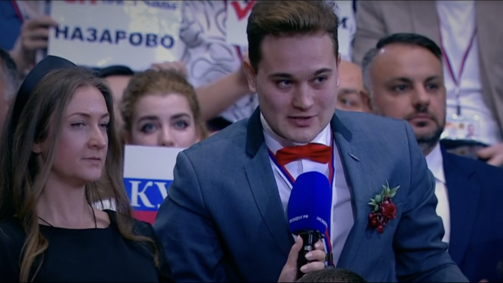 «То, что написано на этом плакате – не просто так. Моя девушка смотрит сейчас прямую линию. Олечка, выходи за меня замуж! И поскольку всё это случилось именно здесь, Владимир Владимирович, мы будем видеть вас на свадьбе!», – произнёс молодой человек.