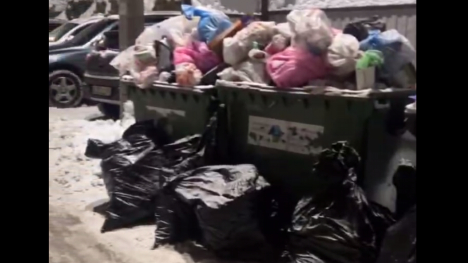 На записи видно, что все контейнеры заполнены «с горкой», рядом с ними стоят чёрные мешки, также забитые мусором.