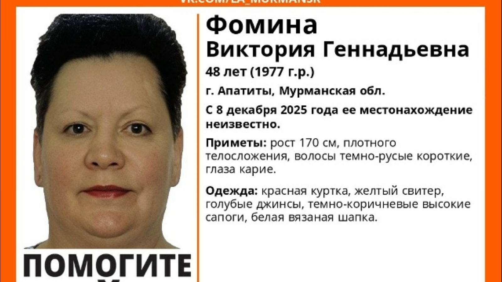 В Апатитах с 8 декабря неизвестно местонахождение 48-летней Виктории Фоминой.