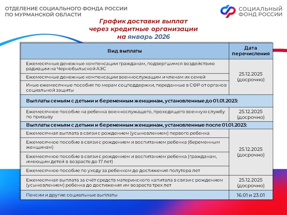 Отделение СФР по Мурманской области опубликовало график выплат пенсий и пособий на январь 2026 года.