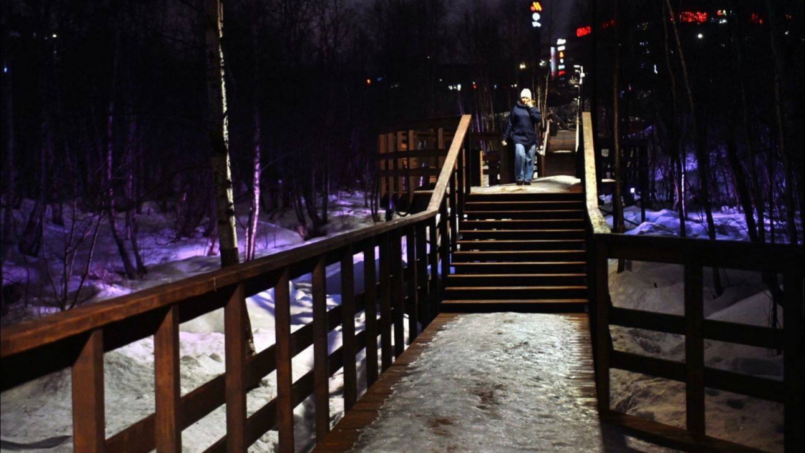 На променаде в парке «Чистый ручей» установили новую подсветку. Яркие разноцветные огни подсветили страшный гололёд на деревянных настилах.