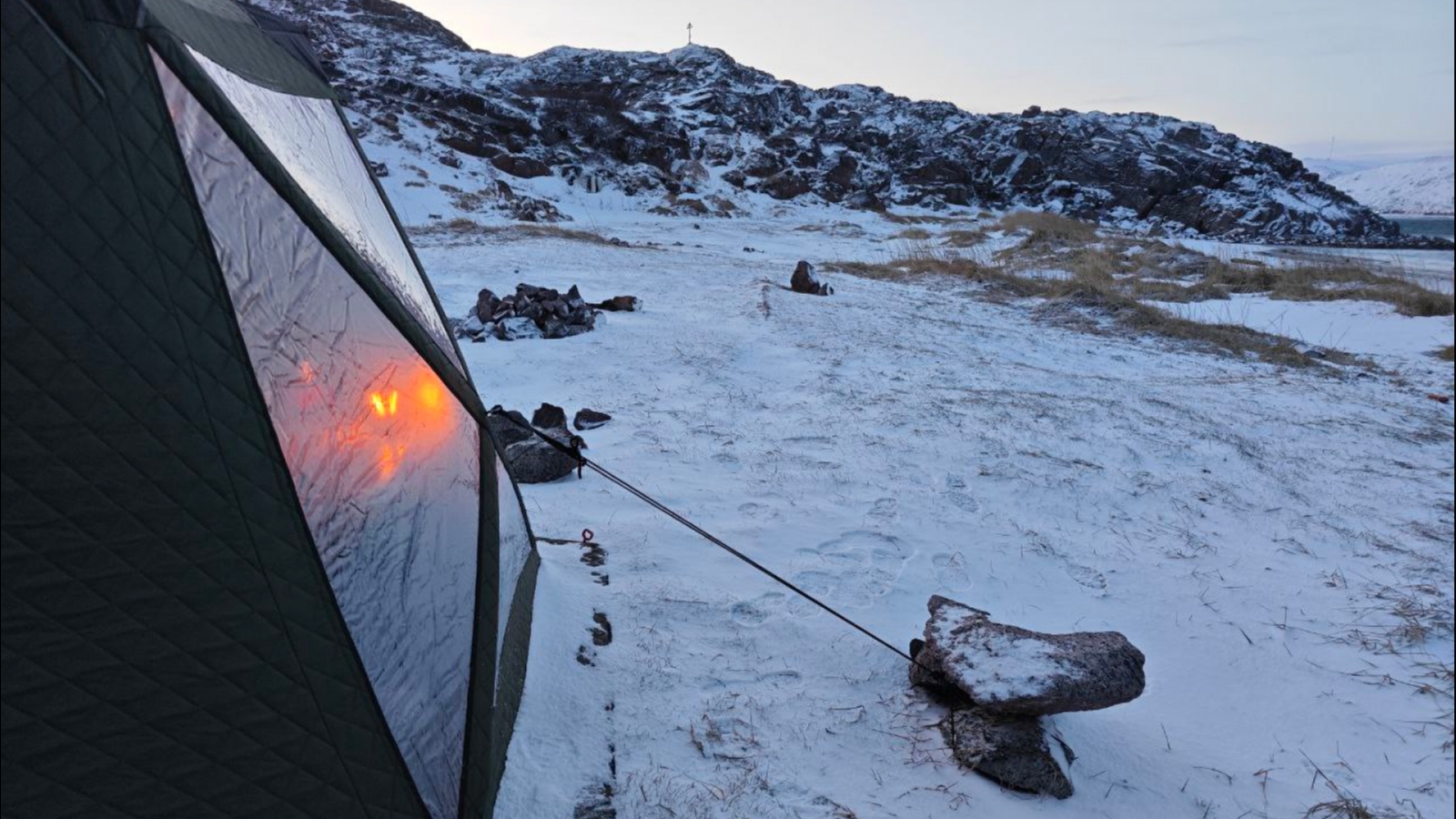 Чтобы палатка не улетела, её привязали к скалам и прибрежным камням. Дрова у путешественников почти закончились ночью, от холода спас дизельный генератор.