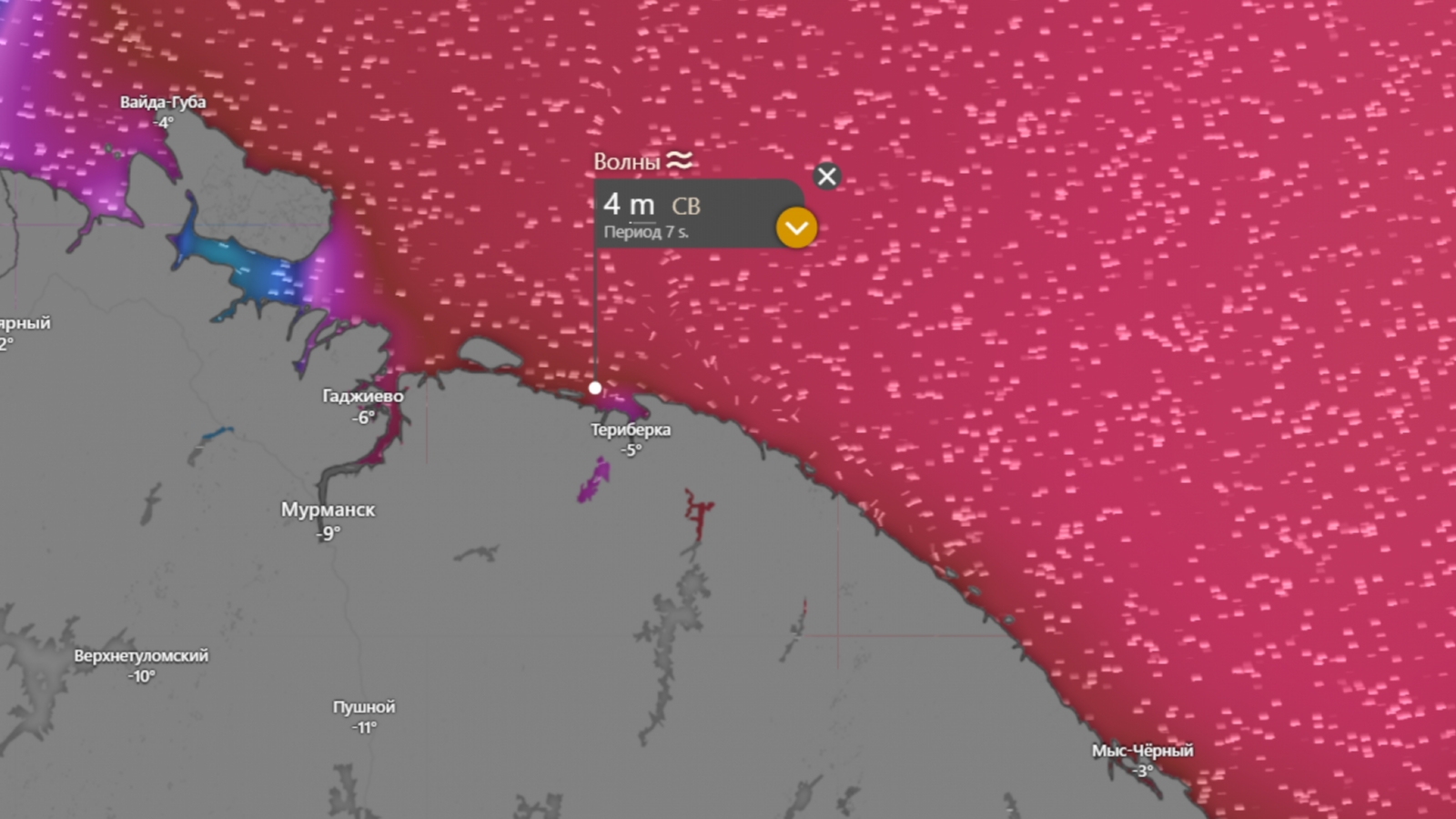 В Баренцевом море высота волн достигает четырёх метров. Такое волнение наблюдается у Териберского мыса.