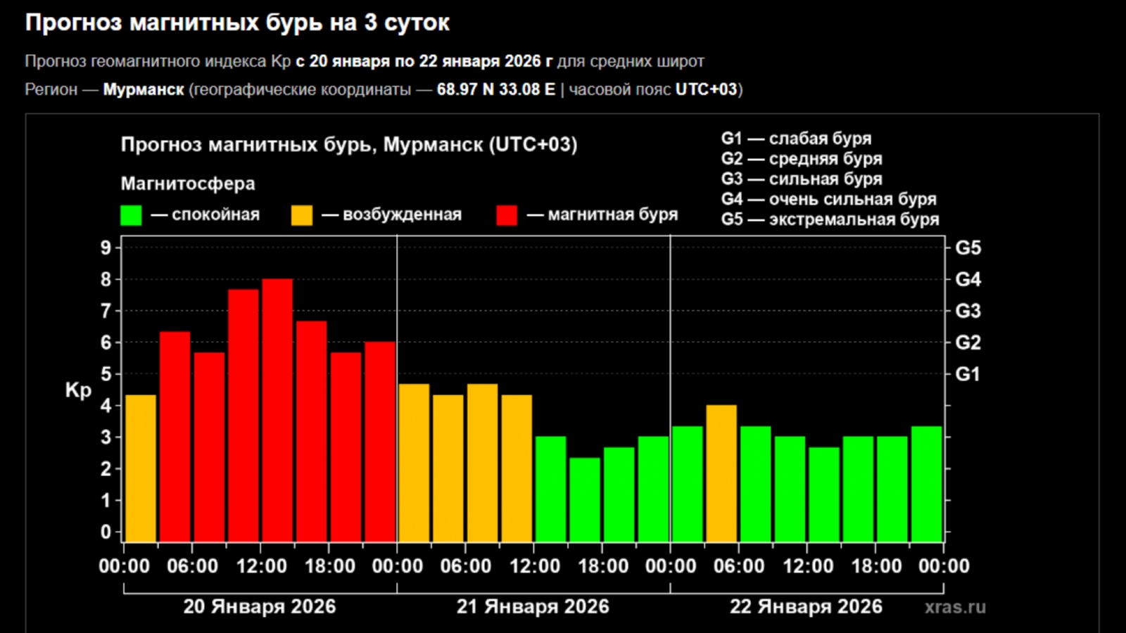 Сильная магнитная буря продолжает бушевать в Мурманской области. Уровень возмущения магнитосферы Земли не опускается ниже G3 (сильная буря).