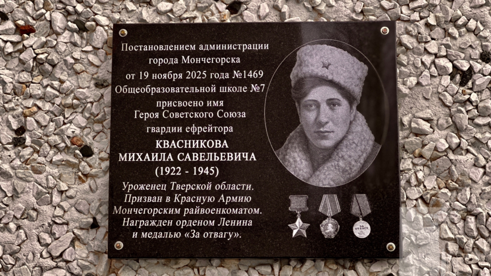 «Михаил Квасников проживал и работал в Мончегорске. В мае 1941 года был призван на службу в Рабоче-крестьянскую Красную Армию и был участником Великой Отечественной войны. К октябрю 1944 года гвардии ефрейтор Михаил Квасников был миномётчиком 28-го гвардейского стрелкового полка. 7 октября 1944 года во время боя у горы Малый Кариквайвишь в Кольском районе он одним из первых ворвался в немецкие траншеи. 9 октября спас от неминуемого плена командира батальона, получившего ранение», - рассказали в мэрии.