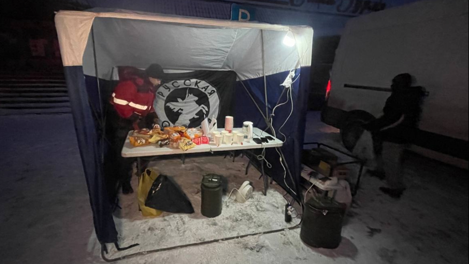 На улице Александра Невского, 81 в Мурманске общественная организация «Русская община» развернула пункт с горячим чаем и генератором для зарядки гаджетов.