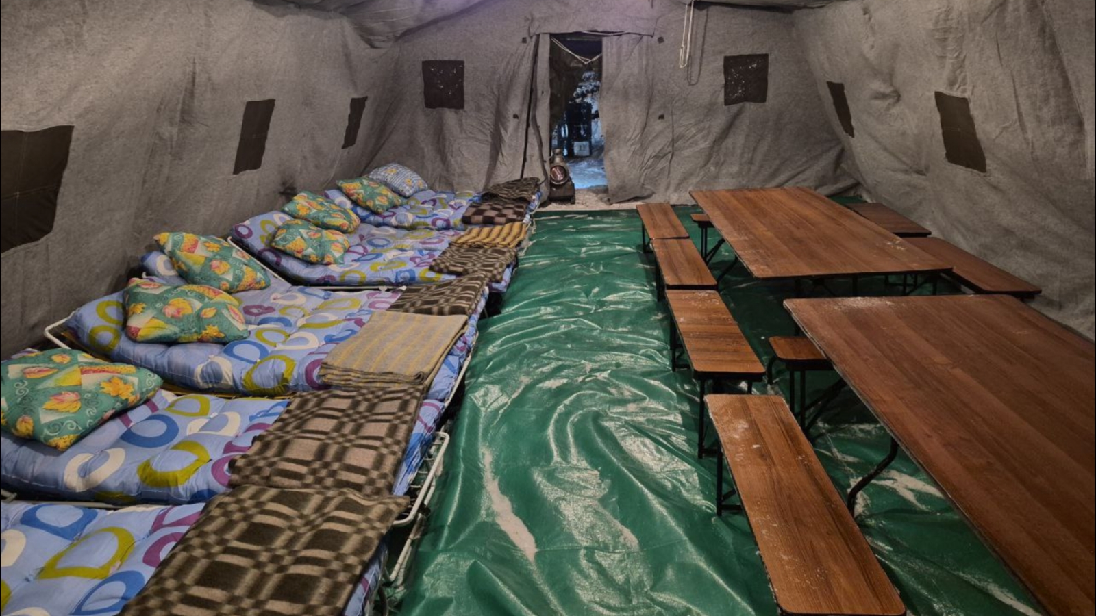 По представленным кадрам видно, что для специалистов развернута полевая палатка, внутри которой оборудованы спальные места, а также столы и скамьи для отдыха и питания.