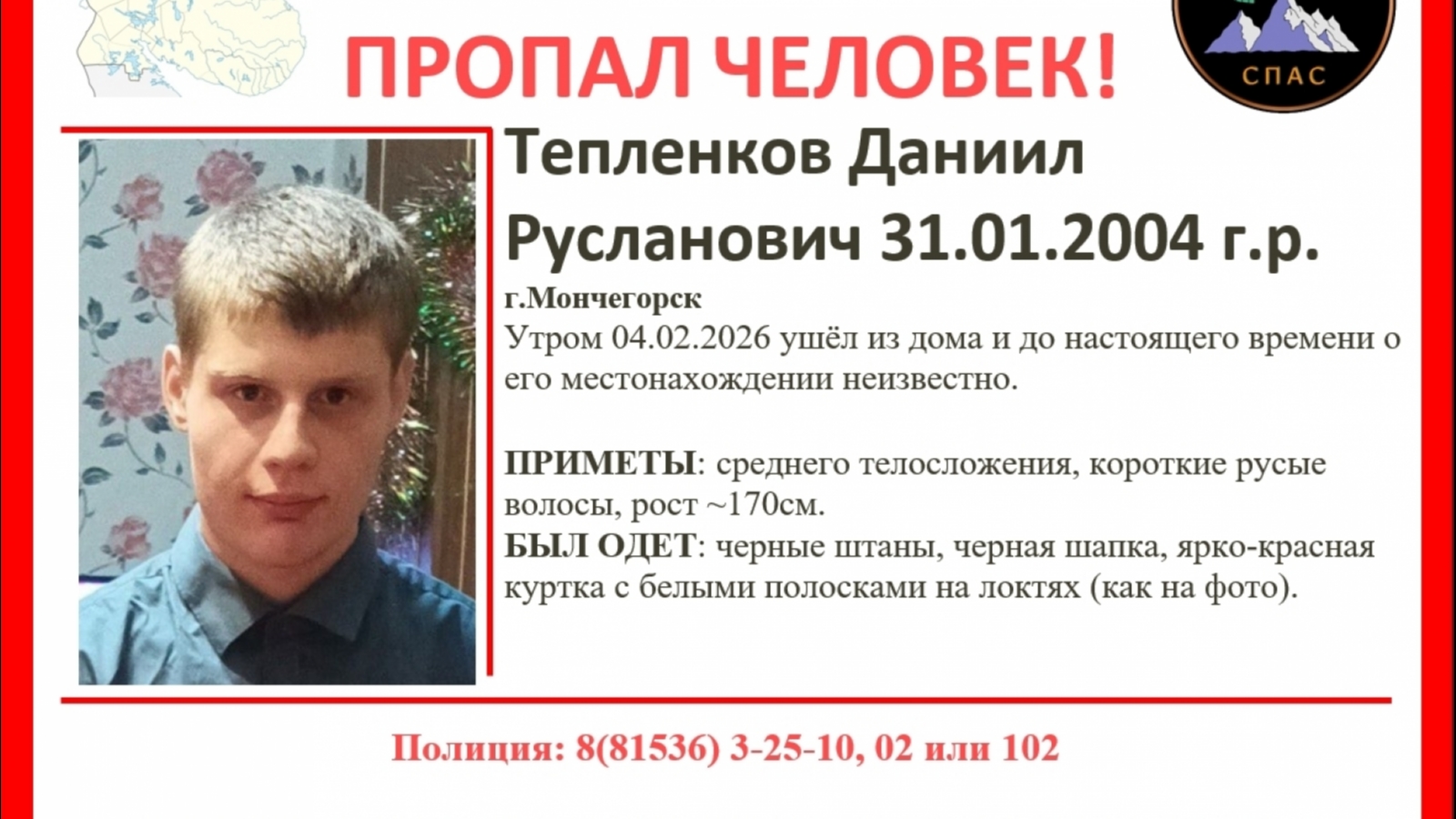 В Мончегорске ищут 21-летнего Даниила Тепленкова. Утром 4 февраля он вышел из дома и до настоящего времени его местонахождение неизвестно.