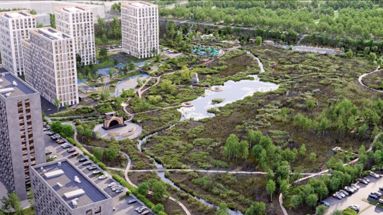 Ключевая идея доработанной концепции — минимальное вмешательство в экосистему. Центральную часть парка, где расположен болотный ландшафт и озеро Варничное, сохранят в естественном виде. Все активные функции — общественные пространства, спортивные и прогулочные зоны — будут вынесены к периметру, на участки с устойчивыми грунтами. Вглубь природной зоны планируется лишь аккуратная интеграция лёгких пирсов и смотровых площадок, позволяющих наблюдать за природой, не нарушая её баланс.