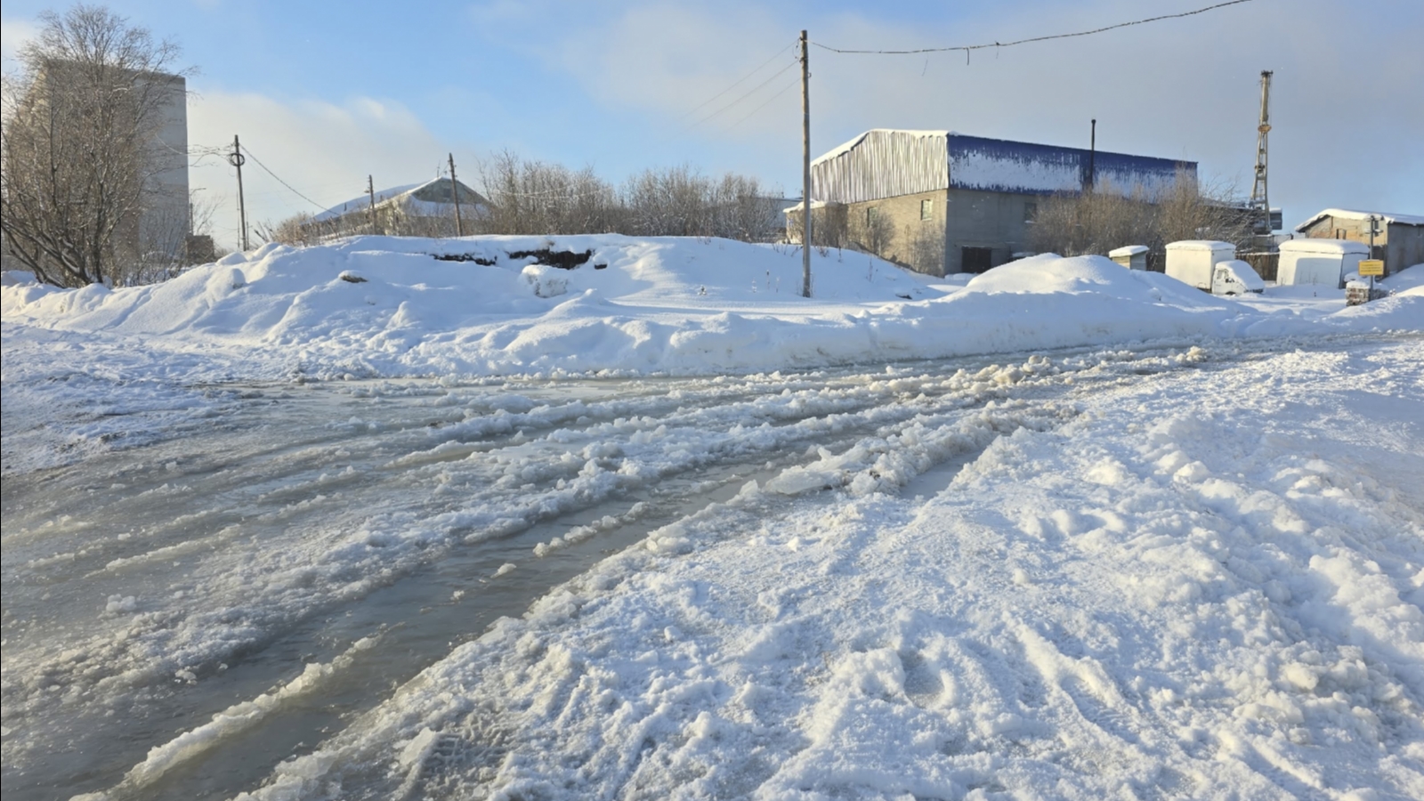 В Мурманске на улице Фестивальной течёт горячая вода по проезжей части. Источник воды находится где-то в районе пустыря, на котором ранее находились жилые дома.