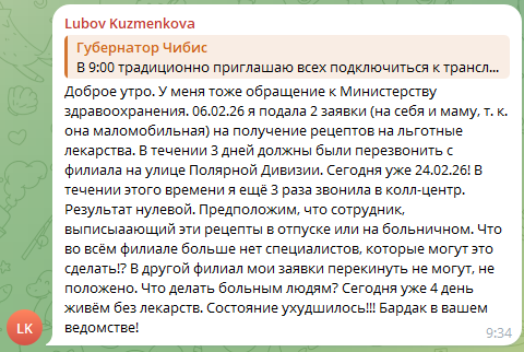 К слову, жители региона жалуются не только на отсутствие лекарств, но и на проблемы с выпиской рецептов. Под трансляцией «оперативки» северянка оставила следующий комментарий: