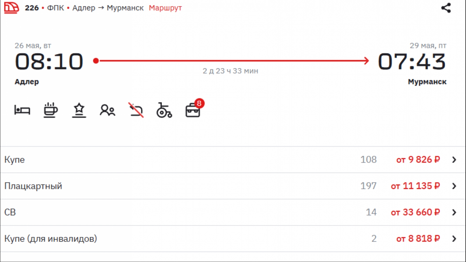 Открылась продажа билетов на поезда 225/226 Адлер — Мурманск — Адлер. Цена билета в плацкартный вагон начинается от 11 135 рублей. Это дороже, чем билет в купе.