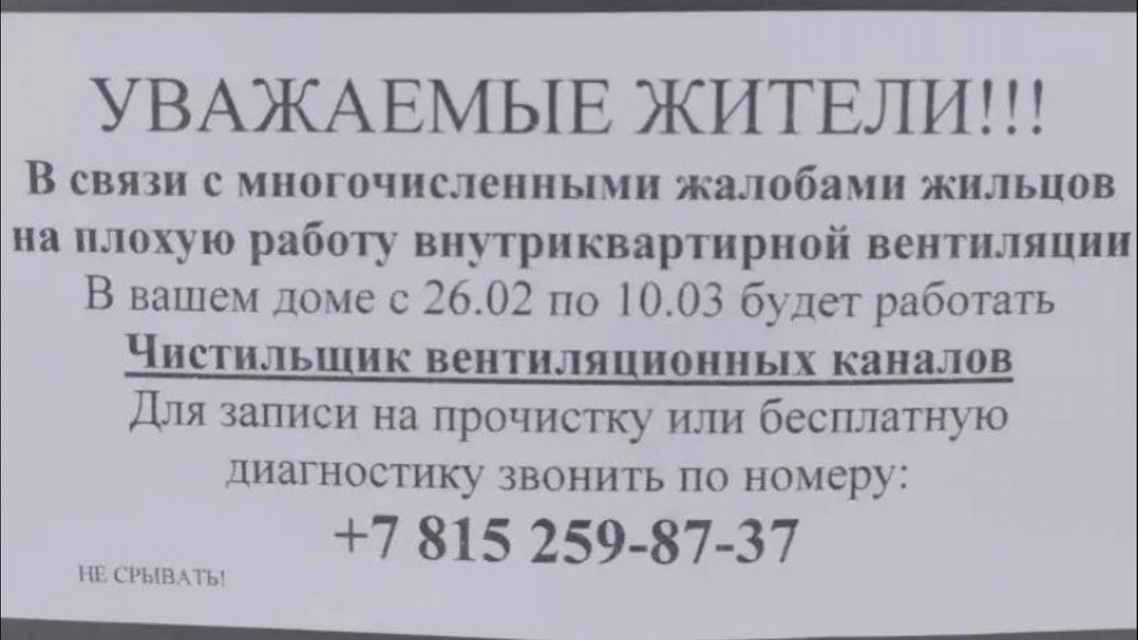 На подъездах Мурманска появились объявления о чистке внутриквартирной вентиляции. Жителям предлагают записаться на прочистку или бесплатную диагностику.