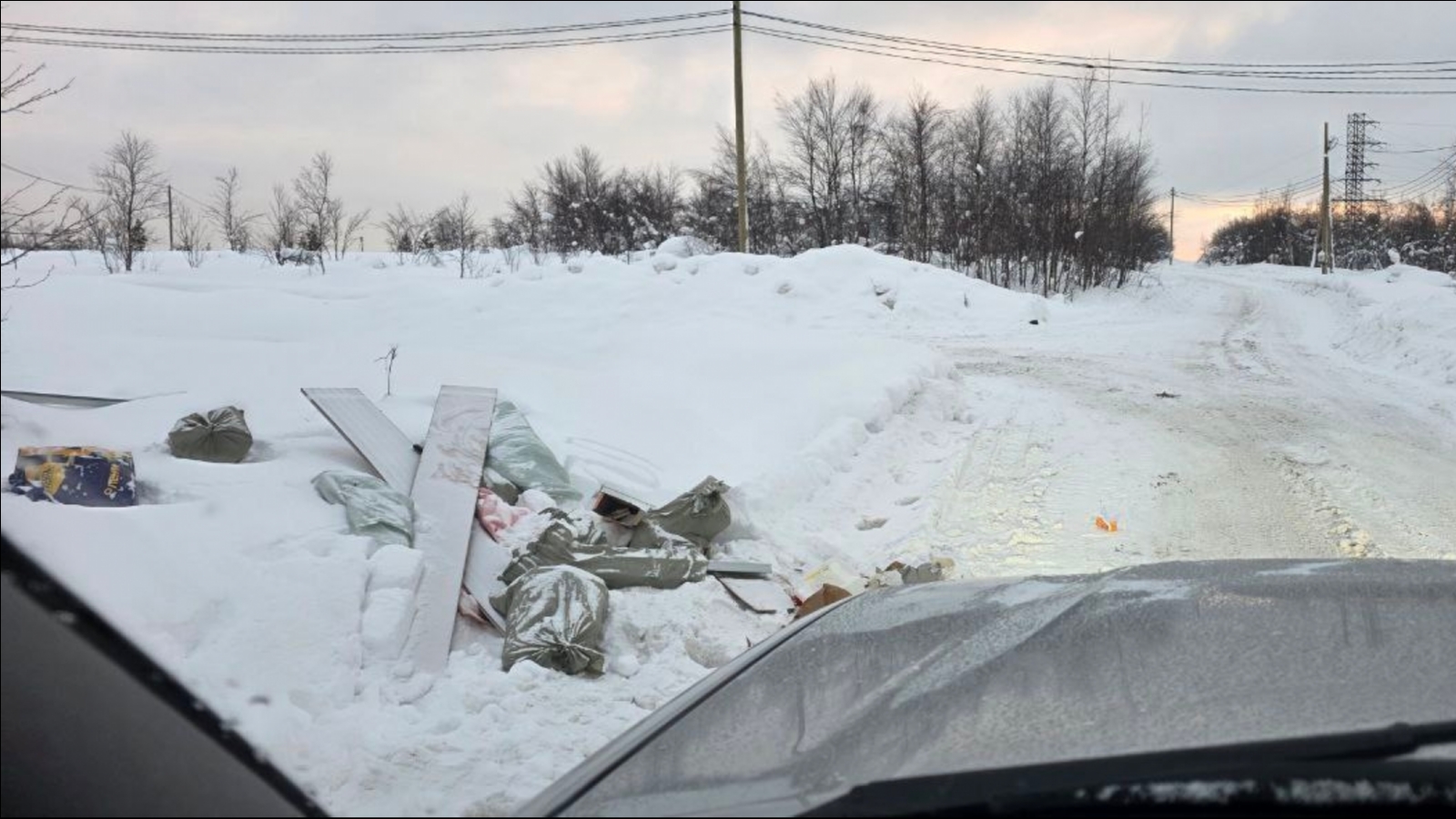 Неизвестные выбросили мешки с мусором в снег прямо у проезда.