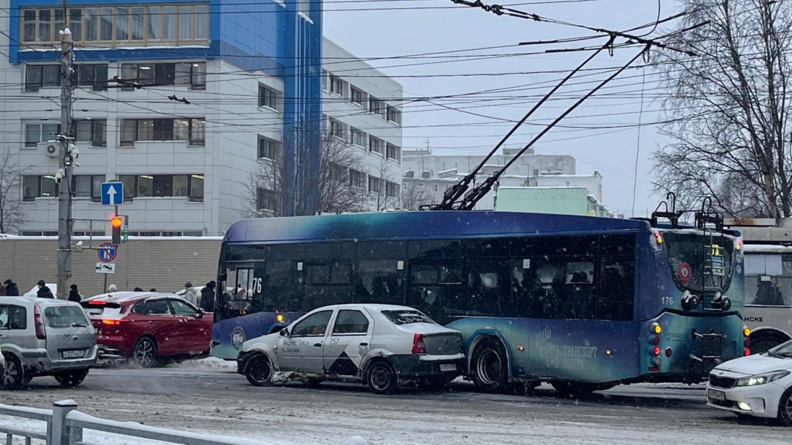 На перекрёстке проспекта Ленина и улицы Полярные Зори произошла авария с участием такси и троллейбуса.