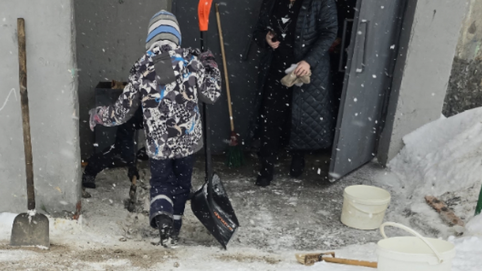 Она объяснила, что сегодня вход в подъезд от снега и льда чистили два тинейджера, а снег у подъезда гребла лопатой женщина.