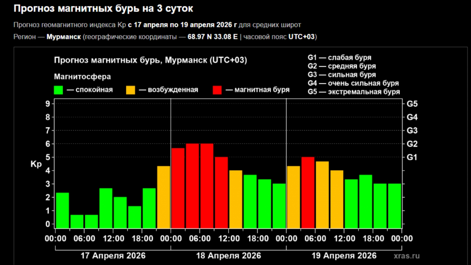 18 апреля после полуночи в Мурманской области может начаться магнитная буря мощностью G1-G2 (от слабой до средней).