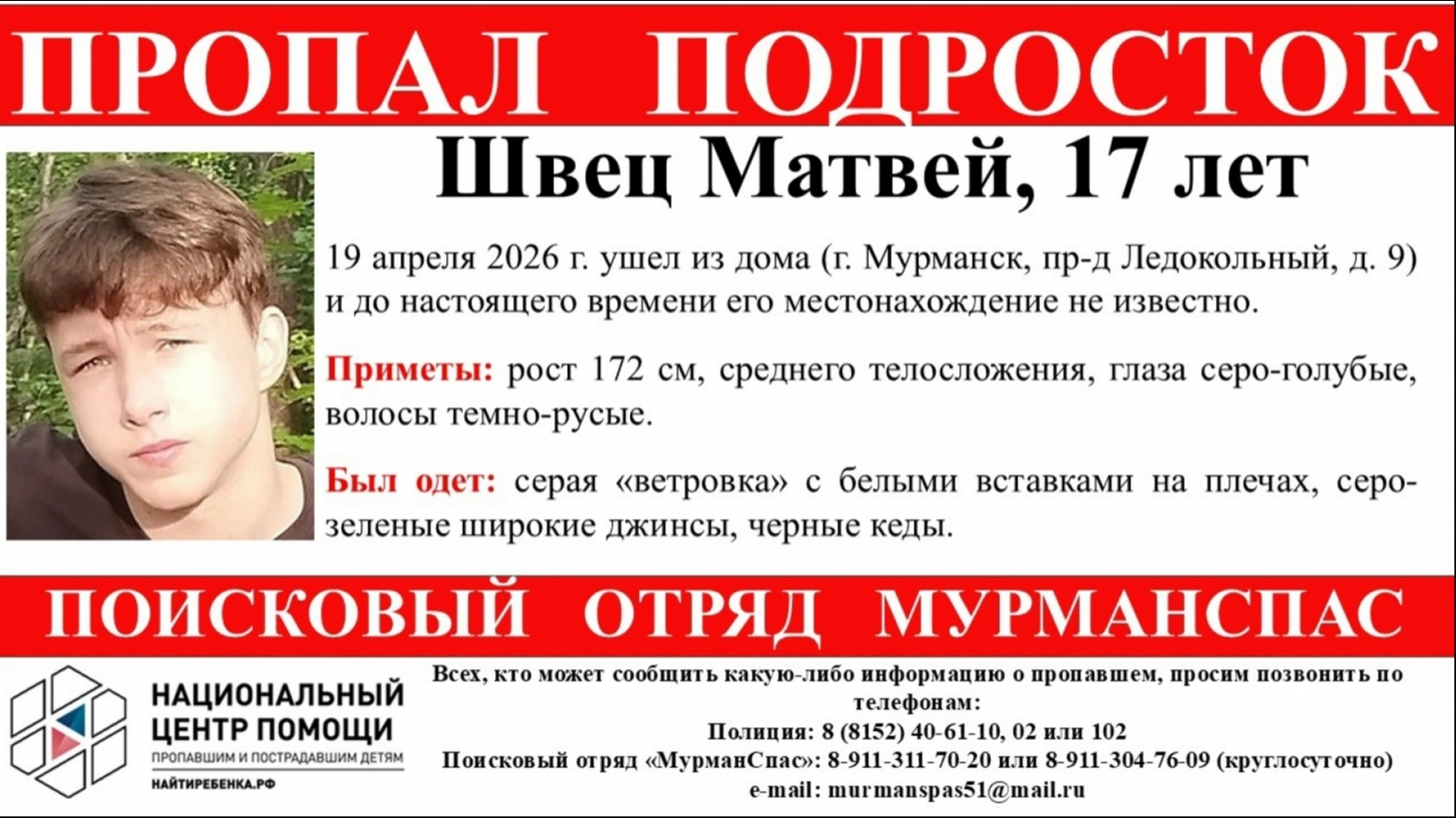 20 04 2026Напомним, ранее 17-летний мурманчанин Матвей Швец ушёл из дома 5 апреля и пропал. Его искали на протяжении нескольких дней.
