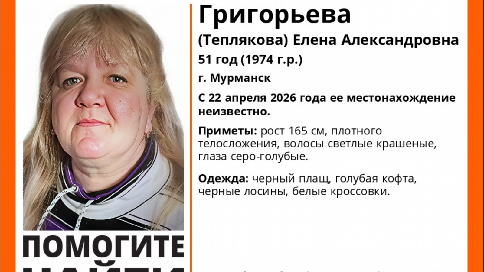 Приметы: рост 165 см, плотного телосложения, волосы светлые крашеные, глаза серо-голубые.