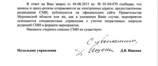 В управлении информационной политики и взаимодействия со СМИ правительства Мурманской области опровергают наличие «черных списков» для журналистов. В редакцию СеверПост пришел ответ на запрос, почему на встречу губернатора с руководством Центра подготовки космонавтов и Ассоциации гражданской авиации не были приглашены журналисты. Точнее были, но только из газеты «Мурманский вестник» и ГТРК «Мурман». В пресс-службе регионального правительства так и не объяснили, почему исключение было сделано для этих СМИ.