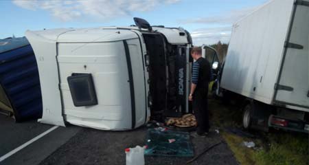 Накануне вечером на 405 км федеральной автодороги Р-21 «Кола» произошло столкновение автомобилей Nissan Qashqai и большегруза Scania. Водитель Nissan не справился с управлением и выехал на полосу встречного движения, где совершил столкновение с встречным автомобилем Scania.