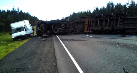 После удара кроссовер съехал в кювет, а большегруз с прицепом опрокинулся и перекрыл полностью проезжую часть.