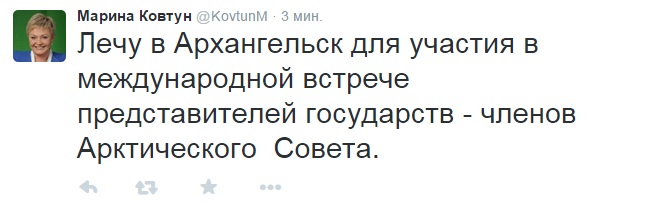 - В рамках встречи пройдет научная конференция «Обеспечение безопасности и устойчивого развития Арктического региона, сохранение экосистем и традиционного образа жизни коренного населения Арктики». Подобный форум под эгидой Совета Безопасности проводится уже в пятый раз в рамках международных встреч представителей Аркт. государств, - написала в своем Twitter Марина Ковтун.